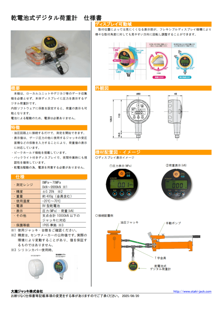 測定レンジ | 0~70MPa 0~9999kN (使用ジャッキ・台数を確認ください) |