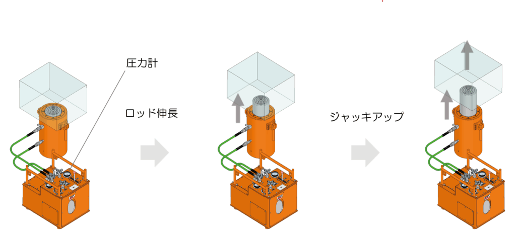 4. 電動ポンプユニットを確認しながら油圧ジャッキに圧力をかけ、載荷物をジャッキアップする。