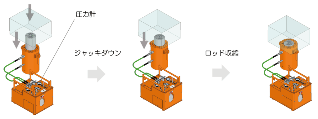 2. 圧力計の値がゼロになったことを確認後、電動ポンプユニットを操作し、ロッドを収縮させる。
