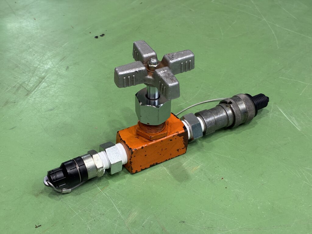 カットバルブは、油圧ラインに直列で設置し、ハンドル操作によって流体の通路を開閉するためのシンプルな金具です。分岐や流量調整機能を持たず、必要なときに「流す/止める」を確実に行うことを目的としています。